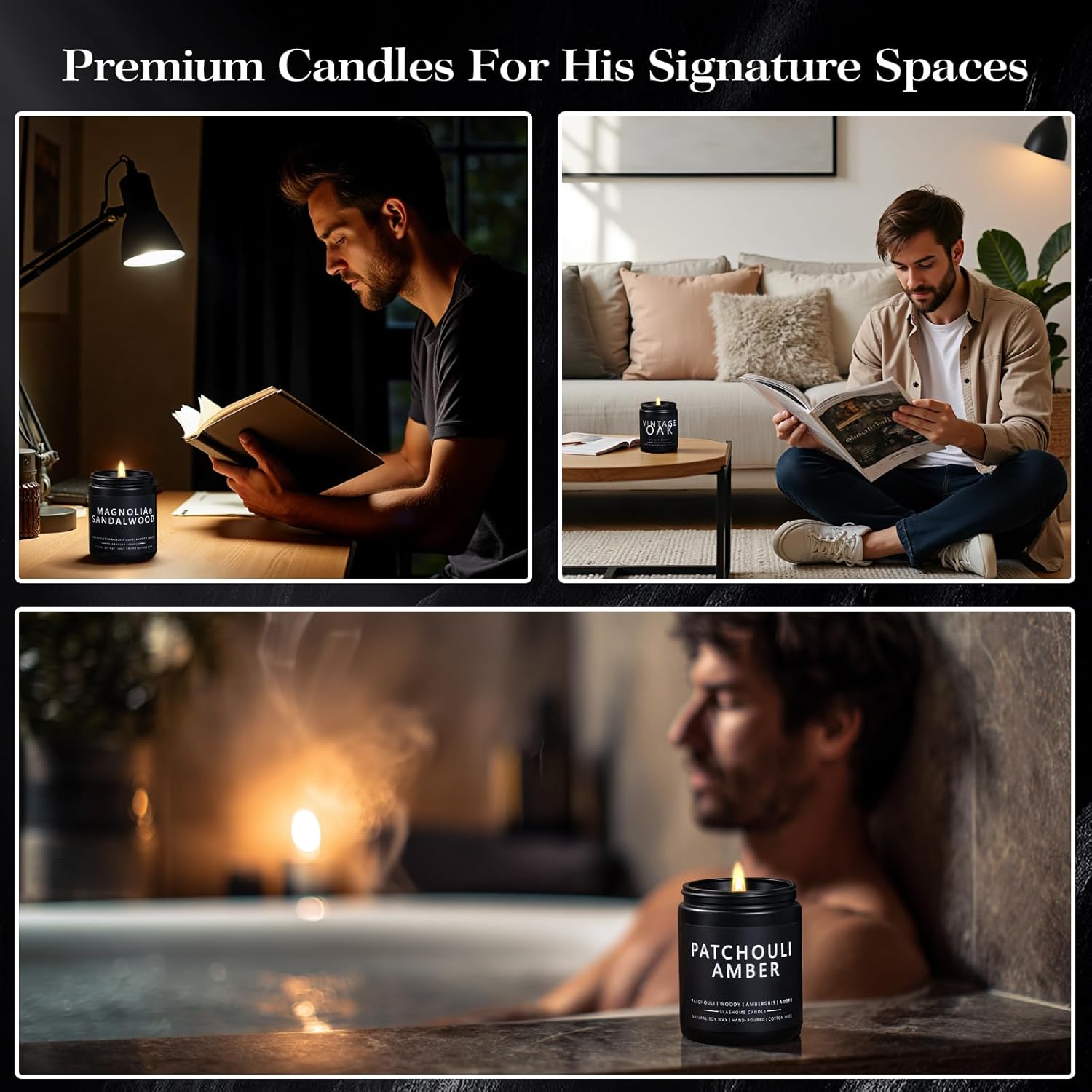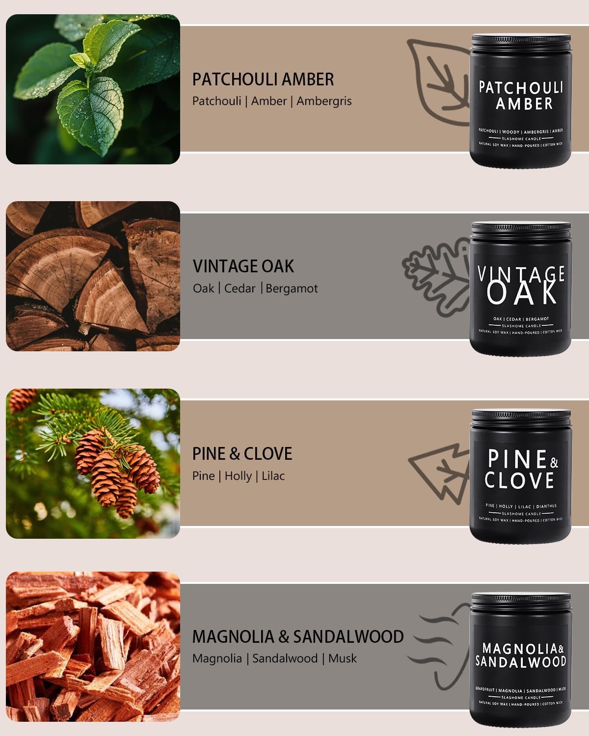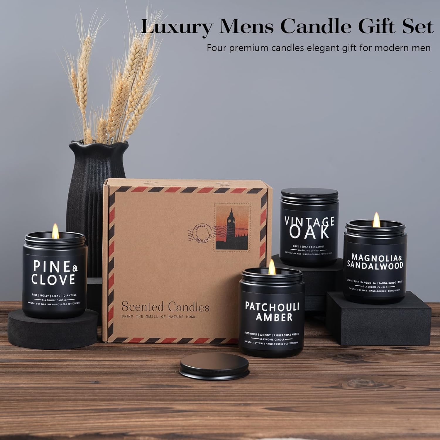 4-Pack Men’s Scented Candles: This premium candle set includes 4 unique fragrances: Magnolia & Sandalwood, Pine & Clove, Patchouli Amber, and Vintage Oak. Perfect for home scented candles, these soy candles elevate any space—ideal for rooms, living areas, or man cave decor