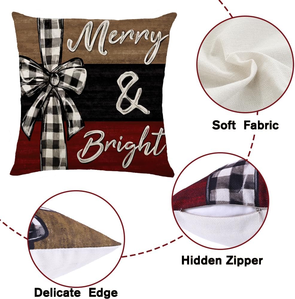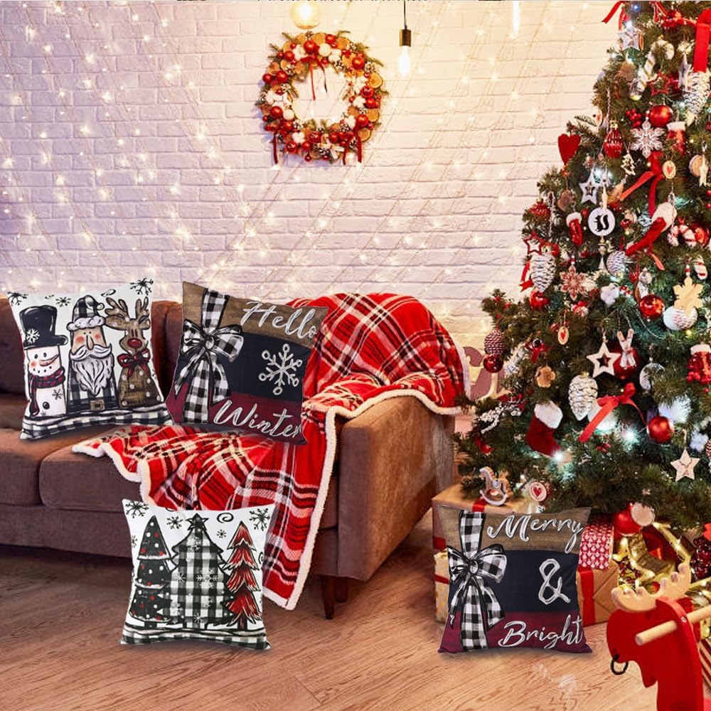 Great Christmas Decor:4 PCS Merry Christmas cushion case ( Not include Insert or filler ),each measuring 18 inches x 18 inches.Pattern is only on the front and no printing on the back.This pillow covers cover will refresh your room, is great addition for Christmas decor. Premium Material: Xmas trees cushion case are made of machine washable 100% polyester,the fabric is soft and comfortable,, no bleeding, fading or fraying issue. Tips: Pillow covers has no stretch effect, best choice 18 x 18 inch insert or smaller insert. Easy to Wear&Care: The winter throw pillow covers is closed with a hidden zipper makes it easier to stuff the pillow/filler core.Well made and wrinkle-resistant, this pillow covers is very easy to care for and can be machine washed on a gentle cycle on low and tumble dried on low, but cannot be bleached. Chic&Innovative Design:This snowman cushion cover is mainly black and red, and uses many Christmas elements, including a unique Christmas tree, a cute snowman, a kind Santa Claus, and a vivid elk. The black and white buffalo plaid is also cleverly designed on the bow. The unique design allows these pillowcases to be perfectly mixed and matched with other pillowcases, bringing you a warm feeling in winter. Wide Application:Our Christmas throw pillow covers are suitable for home, couch, sofa, farmhouseliving room, study room and outdoor use,it can also be given to family, friends and colleagues as a present for Christmas, winter parties or housewarming celebrations,this will definitely be a great winter decoration.