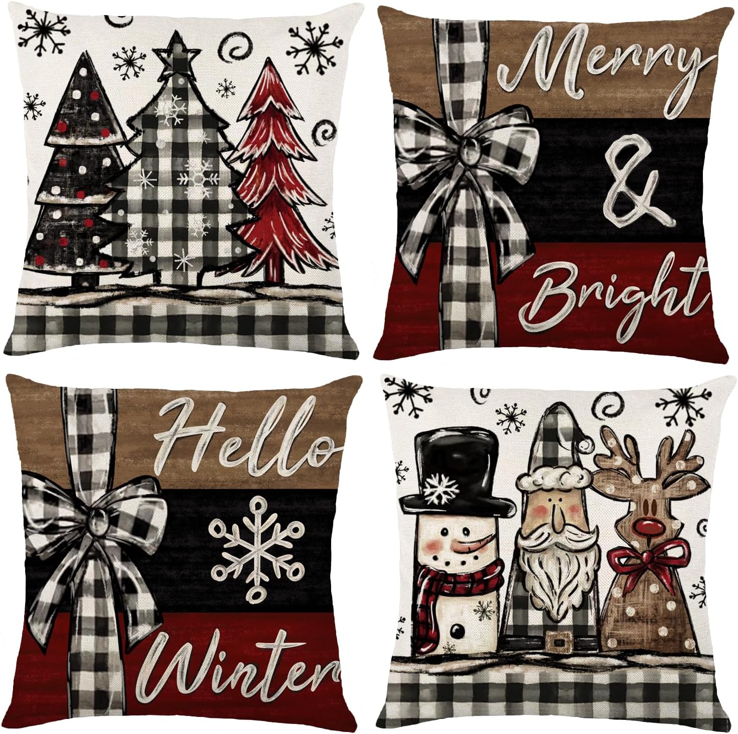 Christmas Throw Pillow Covers Set of 4,18×18 Inch Xmas Trees Snowman Santa Elk Buffalo Plaid Merry Christmas Winter Holiday Farmhouse Decorative Cushion Case for Sofa Couch Decor