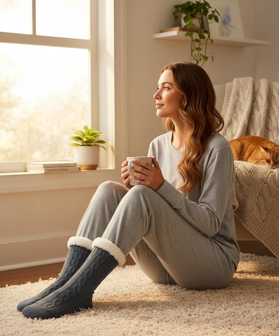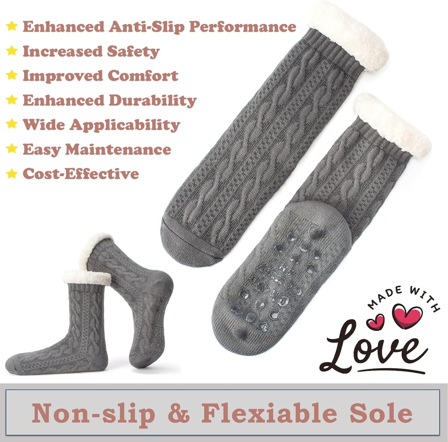 Enjoy the beautiful warmth and comfort of these knitted slipper socks with soft sherpa lining, subtle anti-slip sole, these fuzzy spcks have supreme grip on any hard floor.