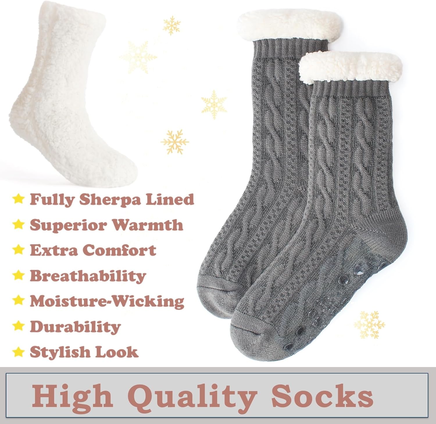 Women’s Knit Slipper Socks with Non-slip Grippers, Warm Fuzzy Fluffy Sherpa Lined, Cozy Christmas Gifts